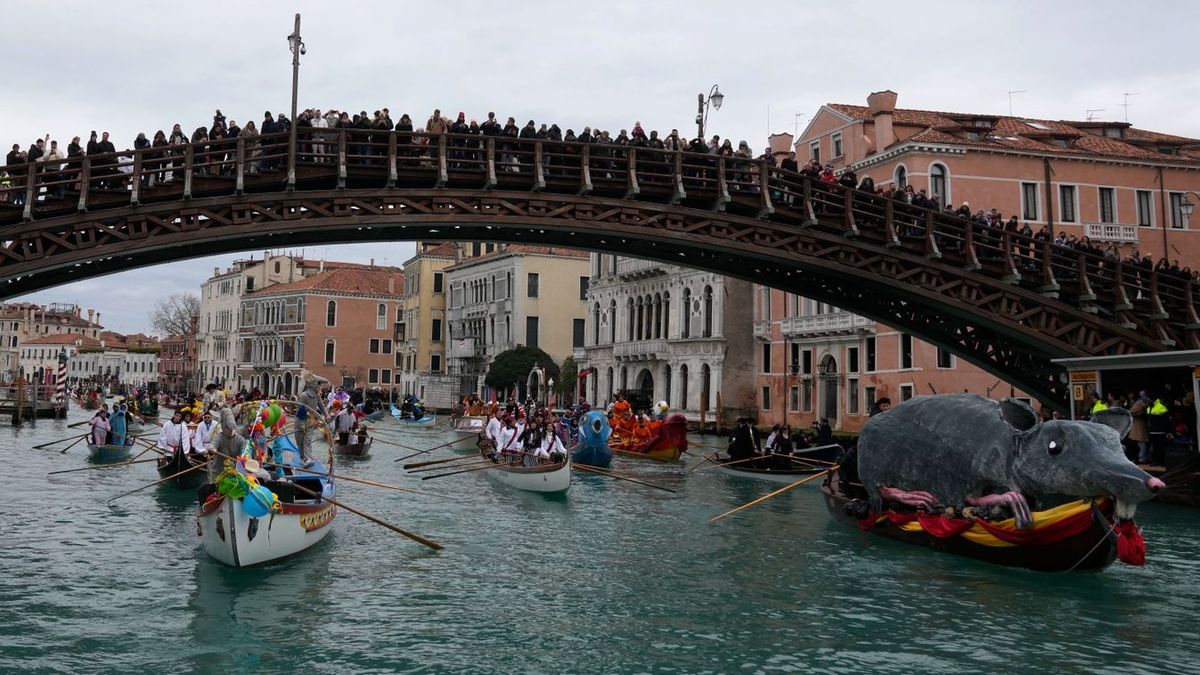 Vasárnap délelőtt tartják a Canal Grande csatornán felvonuló vízi parádét: a jelmezesekkel, akrobatákkal, színészekkel teli hajók élén egy nagy, gipszből formázott patkány halad majd, amely a farsangi időszakban Velencét jelképezi. A Rialto hídhoz érve a patkány szétpukkan, színes szalagokat és léggömböket bocsátva ki magából.