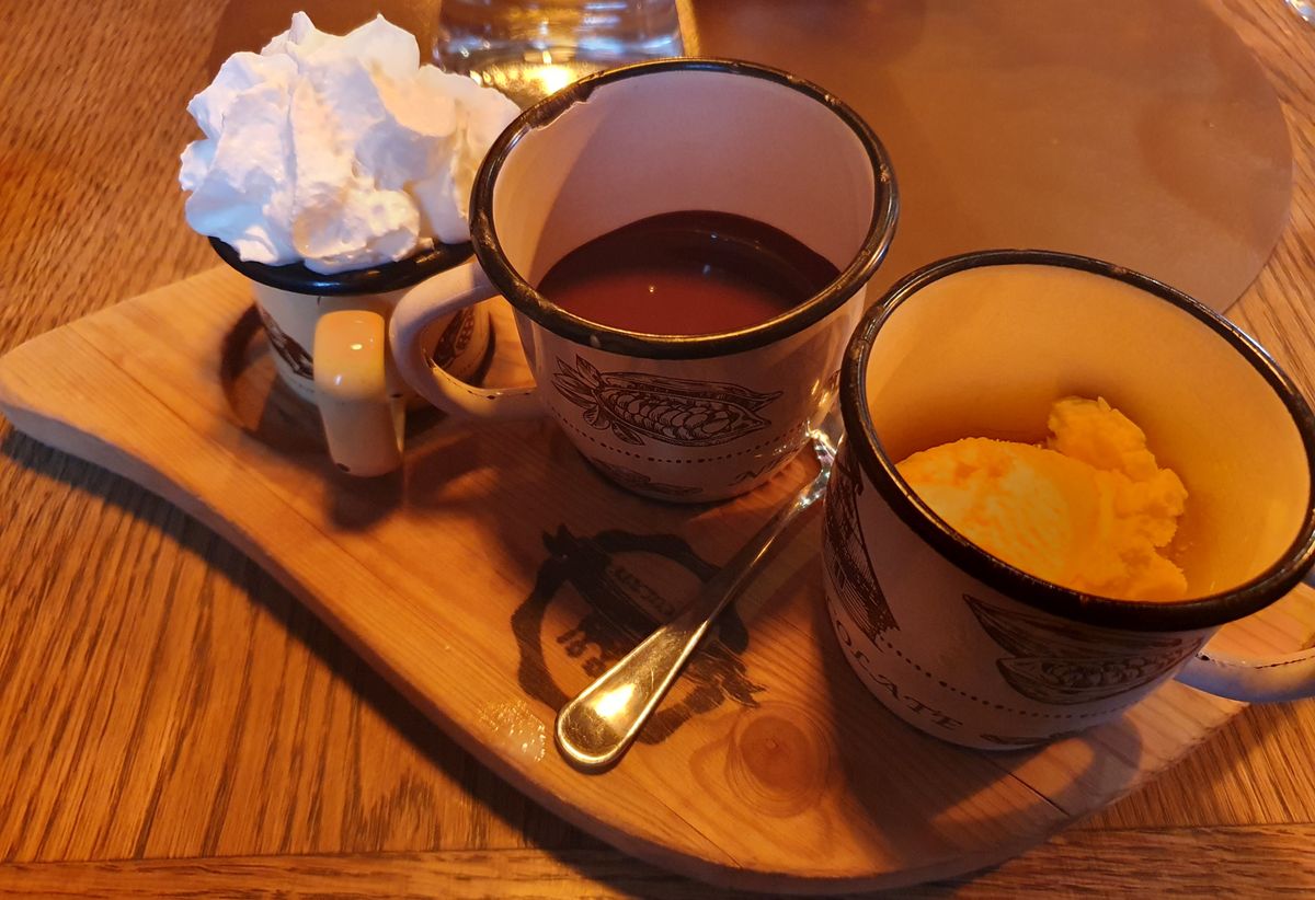 Elsőként a cég saját készítésű csokoládékat és másféle desszerteket kínáló vendéglátó-egységébe térünk be, melynek beltere lélegzetelállító. Akkor még nem tudtuk, hogy működik egy étterem is a monumentális gyártelep keretében, így átadtuk magunkat az édességek élvezetének. A forró csoki itt valóban forró csoki, azaz megolvasztott magas minőségű csokoládé, s nem kakaó, vagy rengeteg tejben feloldott csokoládé. A mellé adott vaníliafagyi átlagos kereskedelmi termék, de élmény belemártani a csokiba, ami rögtön ráfagy és egyfajta szuper-straciatella élményt ad.