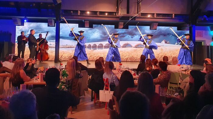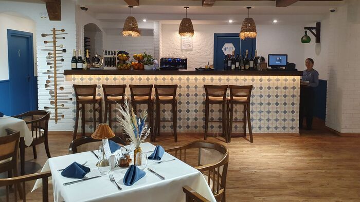 Az asztalon élő virág, gyertyatartó égő gyertyával, ottjártunk idején egy bárzenész adott elő zongorán népszerű magyar slágereket.