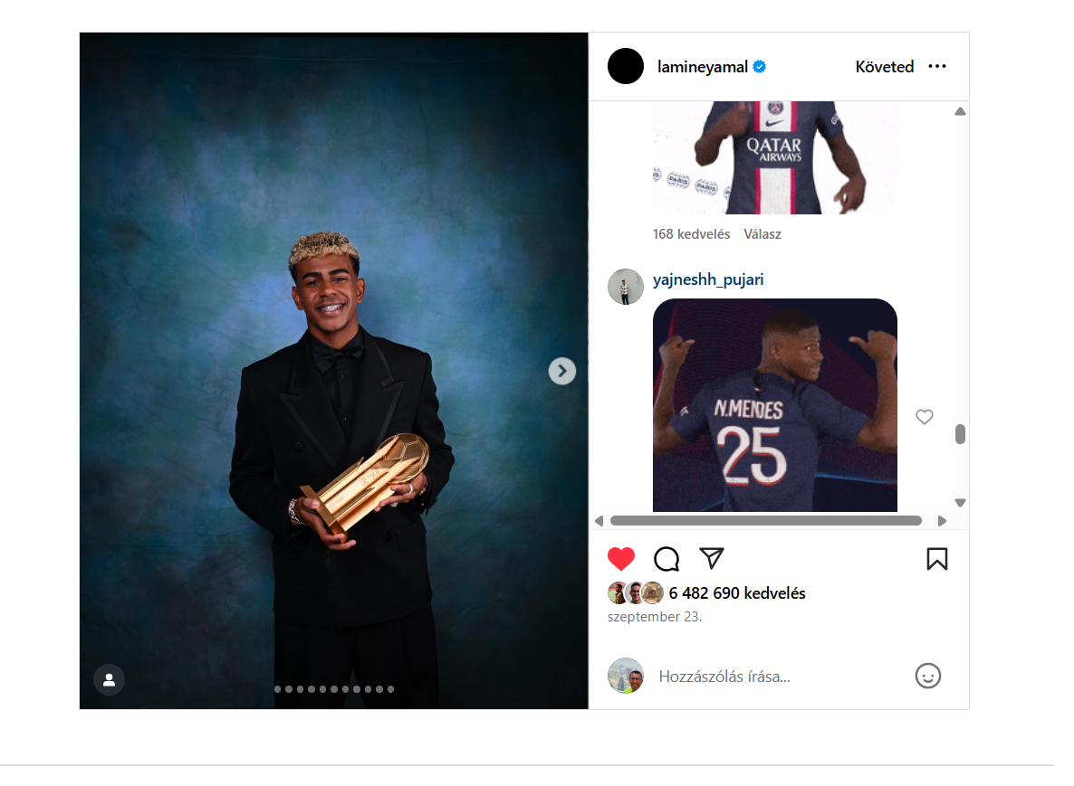 S mindennek az is a következménye, hogy a PSG szurkolói, no meg Yamal ellendrukkerei ez tudatják is a fiatal klasszis Instagram-oldalán, Yamalnak éppen annak a bejegyzésénél, amelyen a 18 éves klasszis az Aranylabda-gálán a legjobb 21 éven aluli játékost megillető trófeával pózol. Yamal persze az Aranylabdát szerette volna elnyerni, de „csak” második lett Ousmane Dembelé, a PSG francia kiválósága mögött, aki a szerdai meccset sérülése miatt kihagyta. Lamine Yamal oldalán sorjáznak a kárörvendő bejegyzések, amelyek szerénységre intik, és elárasztják a Nuno Mendes-gifek, tudatosítva Yamallal, hogy Nuno Mendes megint levette a pályáról.