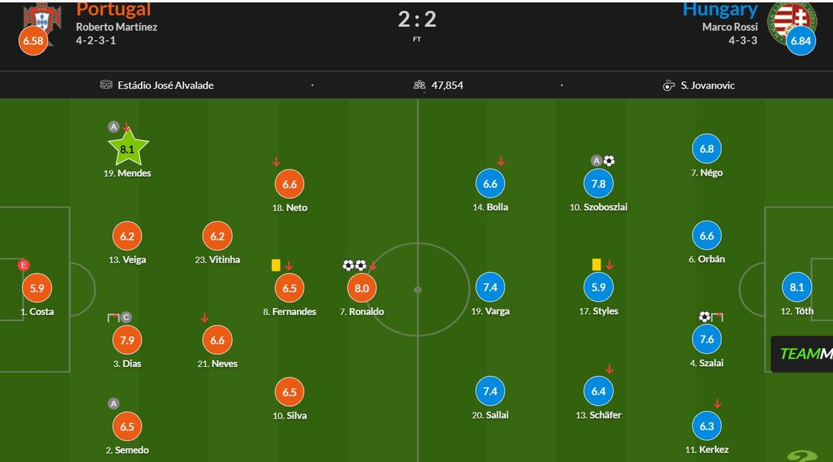 A Whoscored értékelése szerint pedig Tóth Balázs (8,1) volt a mérkőzés legjobb játékosa, itt Szoboszlai Dominik 7,8-as, Cristiano Ronaldo pedig 8-as osztályzatot kapott.