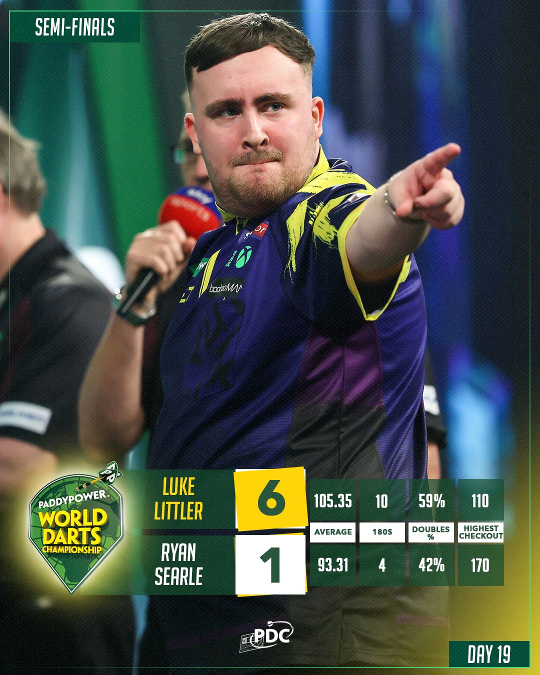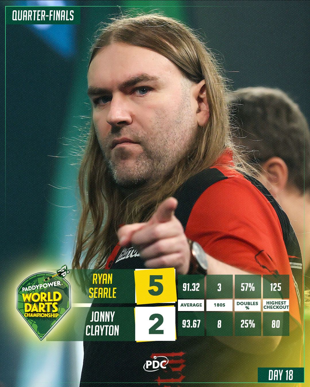 A darts-vb negyeddöntői nem hoztak szoros meccseket. A címvédő angol Luke Littler (a vb 1. kiemeltje) 5:0-ra nyert a lengyel Krzysztof Ratajski, a holland Gian van Veen (10.) 5:1-re az angol Luke Humphries (2.) ellen, míg az angol Ryan Searle (20.) 5:2-re győzött a walesi Jonny Clayton (5.) ellen, és a skót Gary Anderson (14.) is 5:2-re verte az angol Justin Hoodot. Péntekig Littler és Searle egyaránt két-két szettet veszített a vb alatt, a 18 éves angol mégis egyértelmű esélyesként várhatta az egymás elleni elődöntőt, mert húsz évvel idősebb honfitársa még sosem győzte le őt.