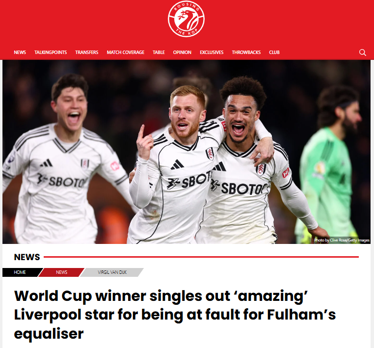 A liverpooli Rousing The Kop, amely idézi, a cikke címének ezt adta: A világbajnok a „csodálatos” Liverpool-sztárt hibáztatta a Fulham egyenlítő góljáért. Lássuk be, ez elég pikírt címadás, és egy korábbi, decemberi cikkükre utalnak, amelyben Erling Haaland, a Manchester City sztárja dicsérte Van Dijkot.
