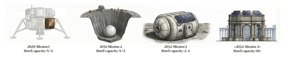 A Holdon épülő szálloda ötlete túlzásnak tűnhet, de a csapat alapos tervet dolgozott ki, hogy a koncepció a vártnál hamarabb megvalósuljon. 2029-ben akarják elindítani az első Hold-küldetésüket a NASA Commercial Lunar Payload Services (CLPS) szolgáltatásával. A CLPS-program keretében magáncégek kisebb rakományait juttatják el a Hold felszínére.